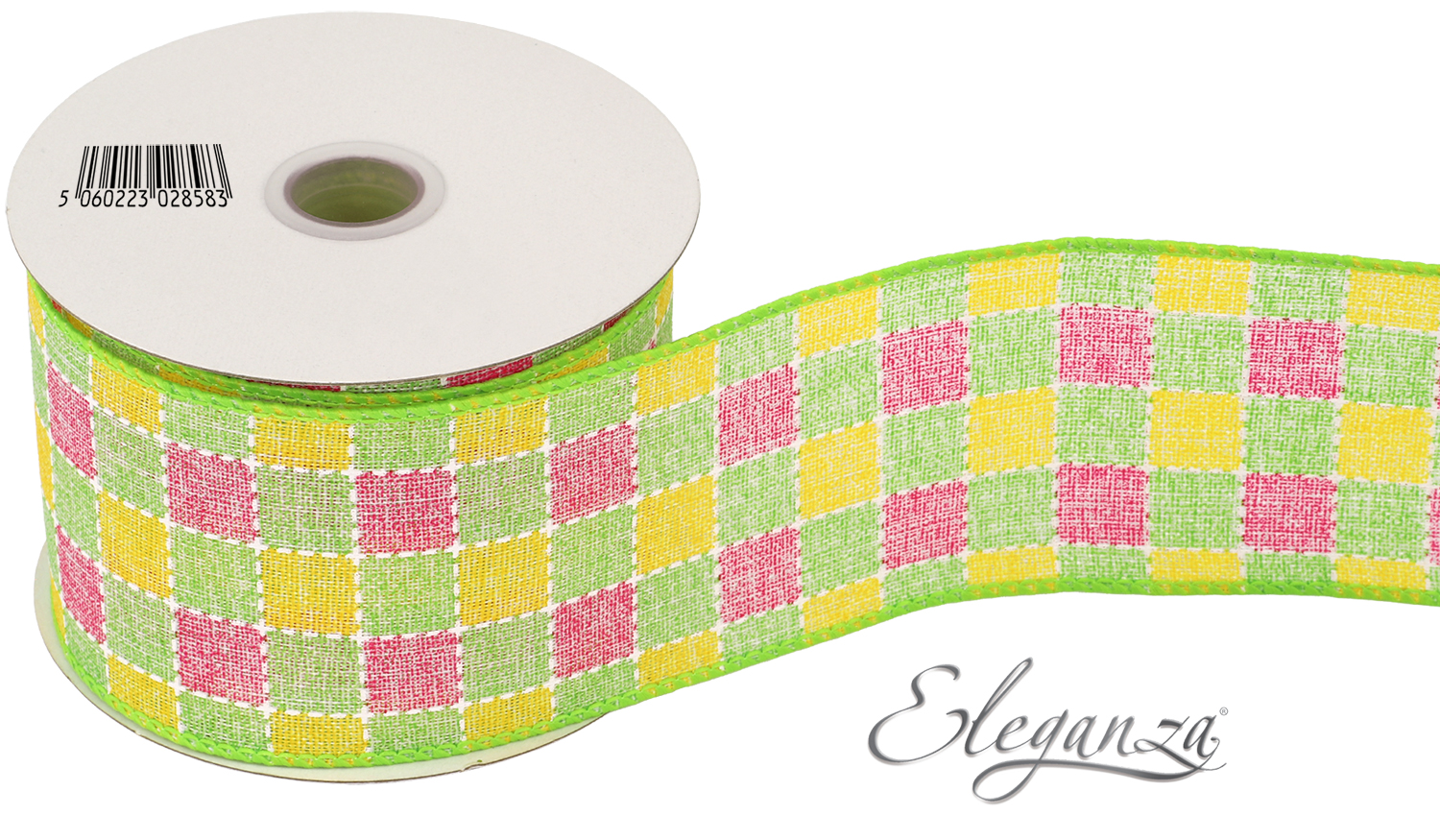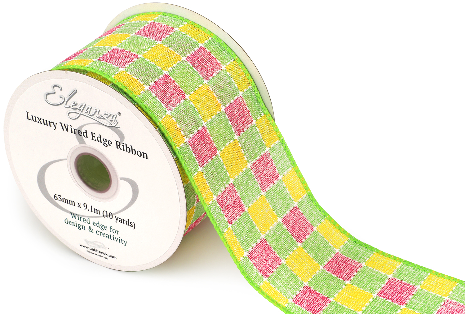 Eleganza Wired Edge Ribbon Green Pink & Yellow Chequered 63mm X 9.1m Design.428